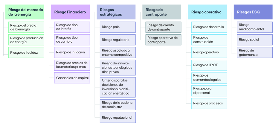La gestión de riesgos de EDPR tiene como objetivo cubrir de manera integral todos los riesgos de la empresa. Para mantener una visión holística, los riesgos se categorizan en Mercado Energético, Financiero, Estratégico, Contrapartida, Operacional y ESG.